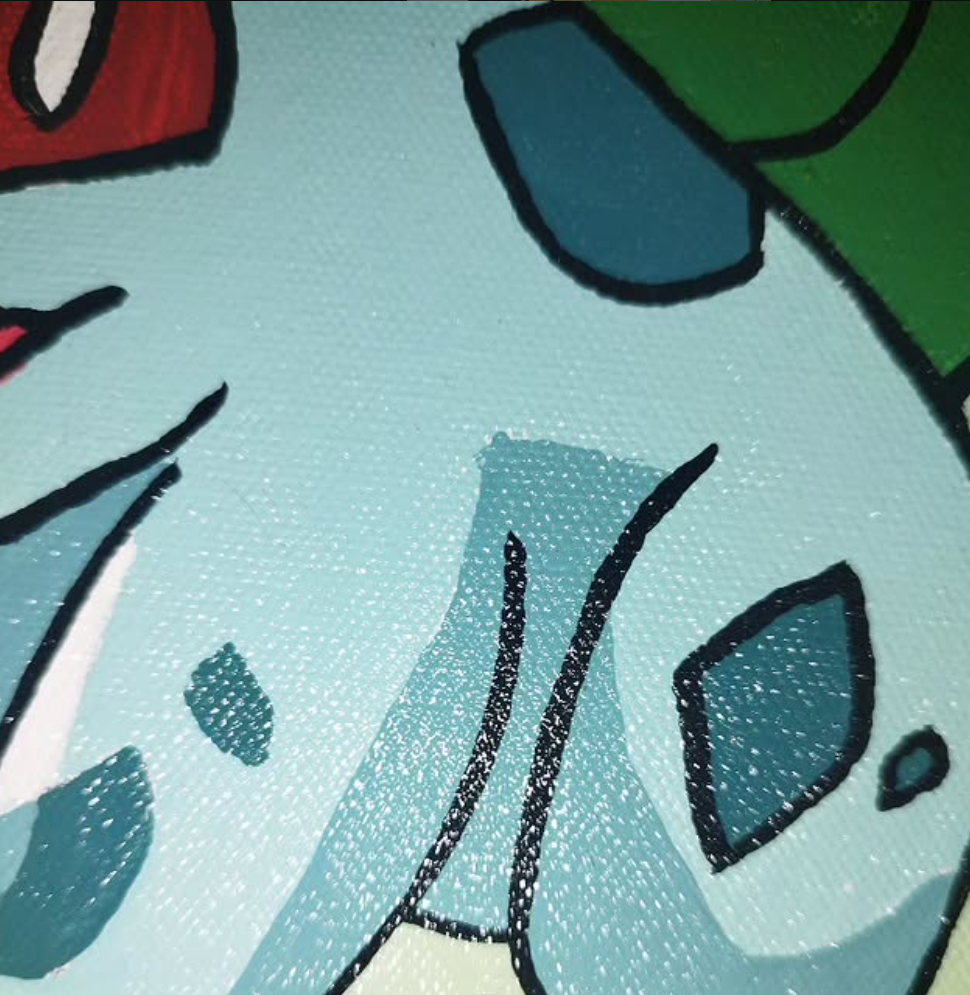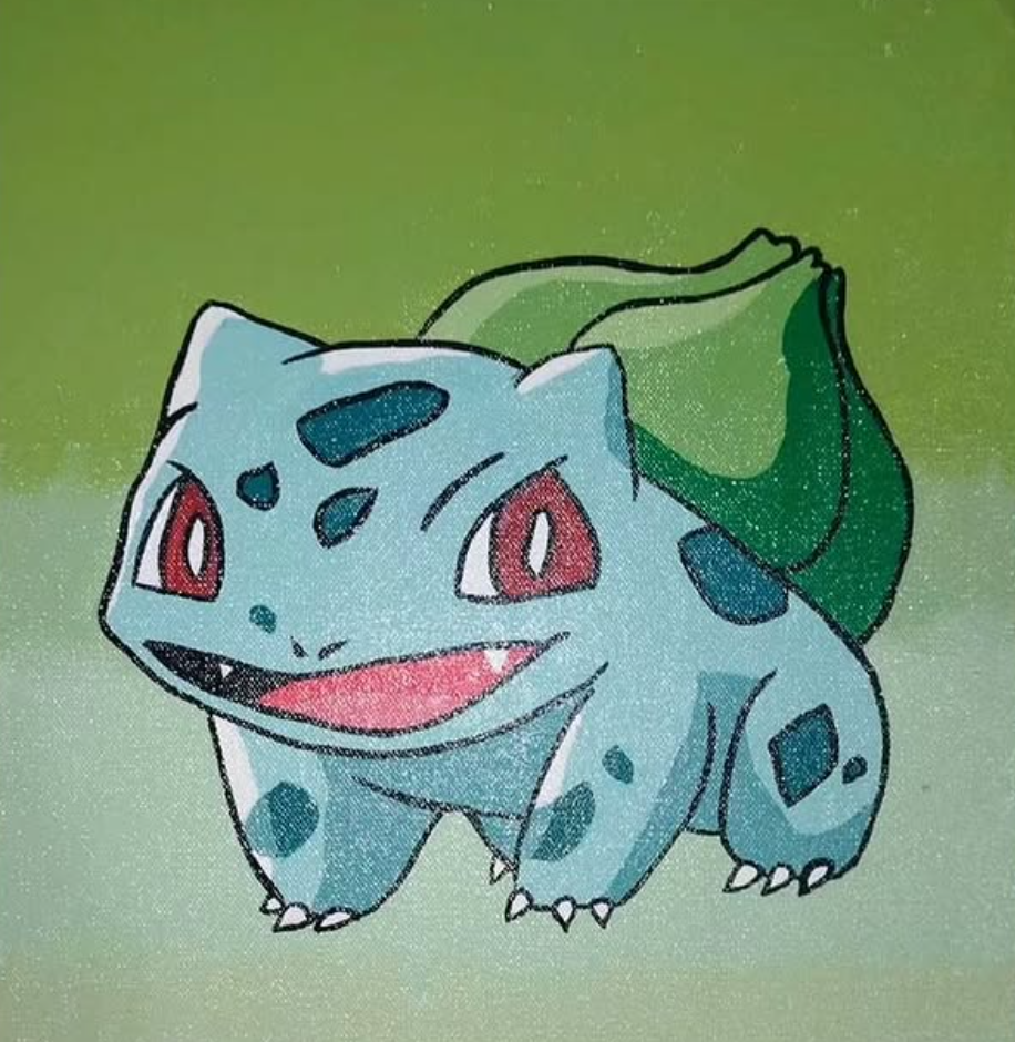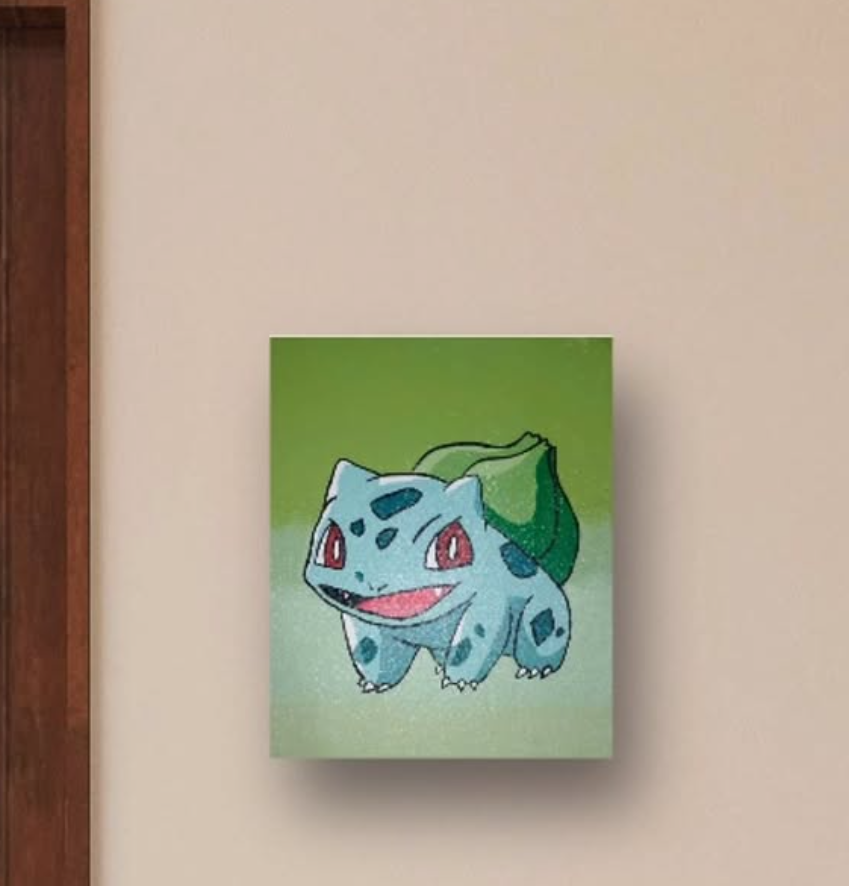 El cuadro tiene dimensiones compactas (30×25 cm), ideales para integrarse fácilmente en cualquier rincón de tu casa, oficina o espacio de colección. Cada detalle y pincelada fue cuidadosamente diseñado para capturar la esencia de Bulbasaur, el Pokémon icónico, y ofrecer una interpretación única que lleva el fanart a un nivel superior.